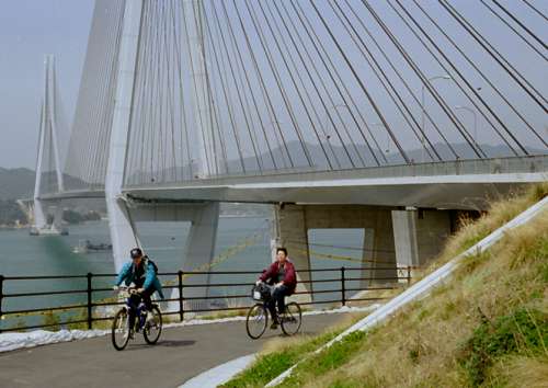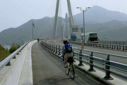 多々羅大橋のアプローチを昇る松尾君と西垣君
