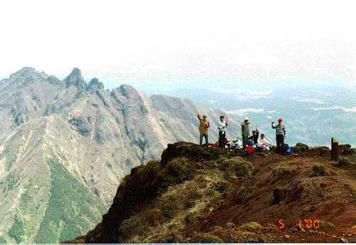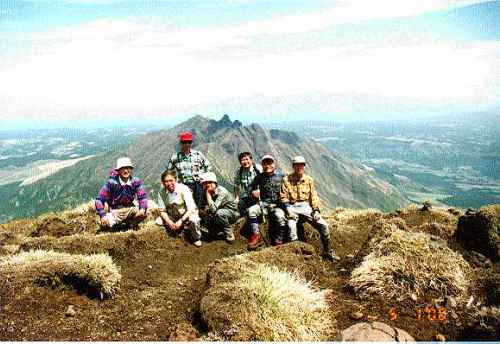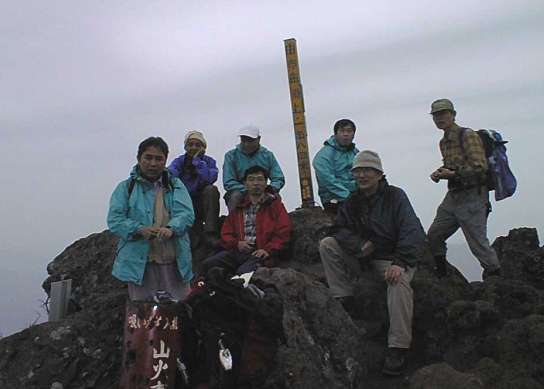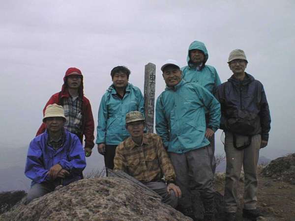 雨中の記念撮影 下山ルートを東口登山口にとる